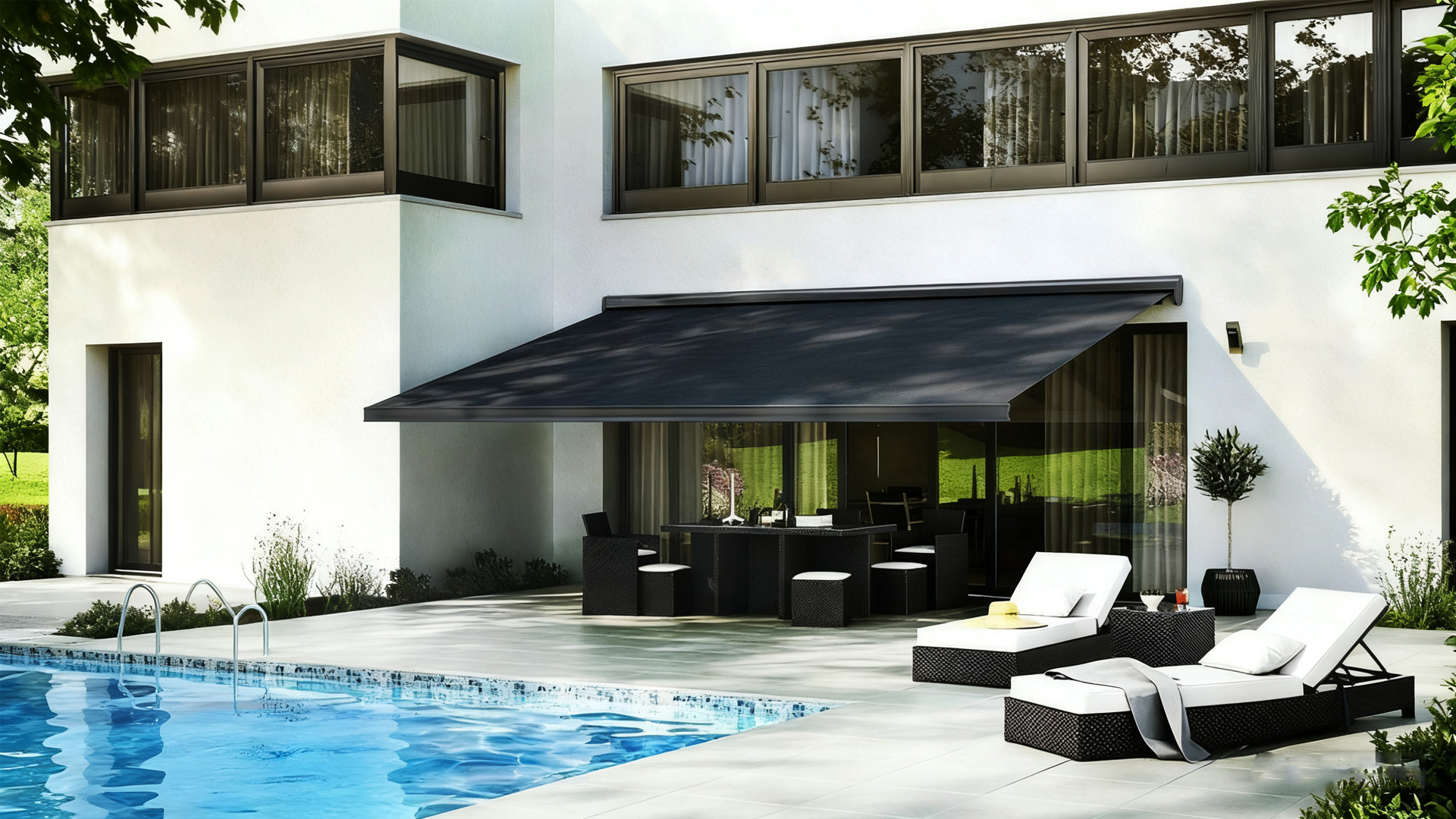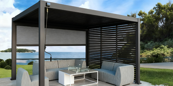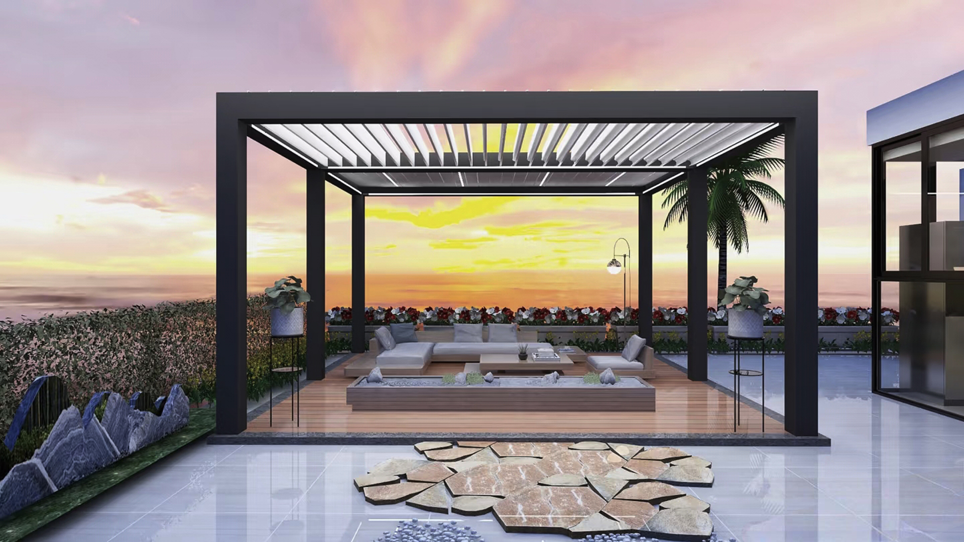 Adjustable louvers for sunshade & rain protection, usable in all weathers.